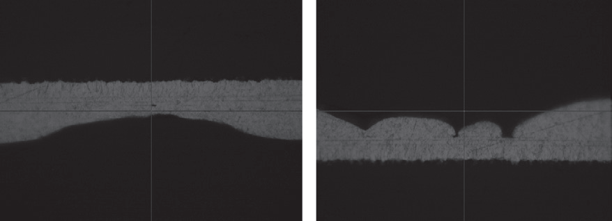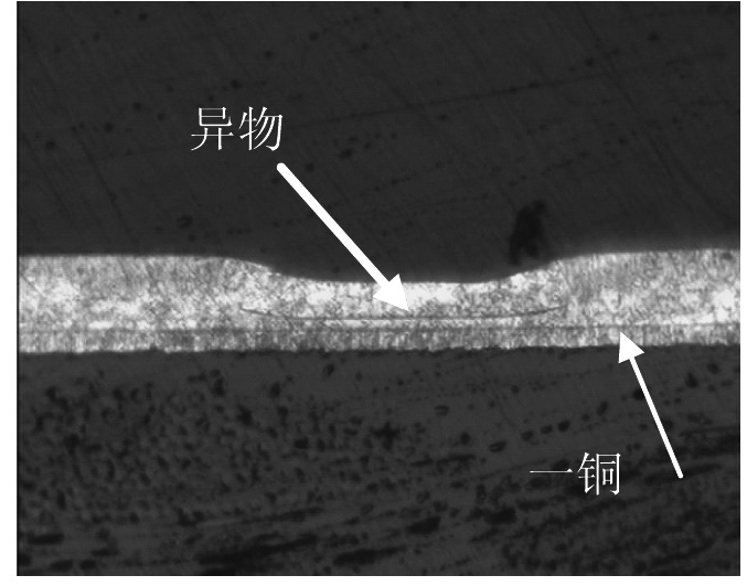 圖形轉(zhuǎn)移刷板的目的是去除印制板板面氧化及臟污。若刷板機(jī)對板面清潔不凈,板面上的多余物會抑制二銅的電鍍,形成鍍銅凹坑。我研究所一段時期鍍銅凹坑缺陷頻繁發(fā)生,對凹坑處進(jìn)行金相剖切,微蝕后可看出二銅上明顯有異物阻礙了其繼續(xù)電鍍(如圖4)。分析原因為使用的磨料刷輥式刷板機(jī)目數(shù)不合適,刷板效果差,且刷輥應(yīng)用老化導(dǎo)致(刷板機(jī)一段目數(shù)為320目,二段為500目)。將刷板機(jī)一段更換為500目、二段更換為800目后,鍍銅凹坑缺陷消失。